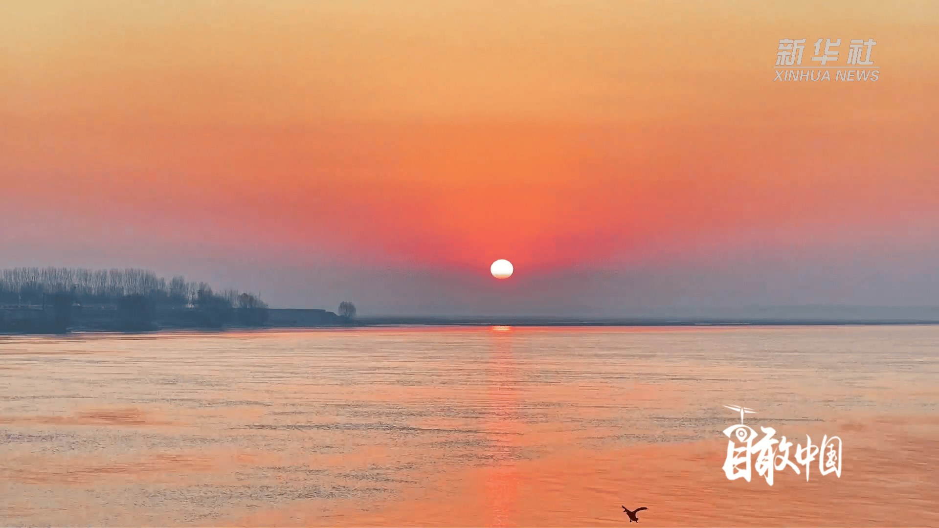 近日,在河南省新乡市黄河湿地鸟类国家级自然保护区内,冬日暖阳携漫天霞光冉冉升起,为流淌的河水披上璀璨金纱。
