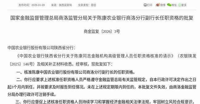 2026年1月9日,根据国家金融监督管理总局消息,《中国农业银行陕西省分行关于陈康同志金融机构高级管理人员任职资格核准的请示》获得通过,批复陈康中国农业银行股份有限公司商洛分行副行长的任职资格。