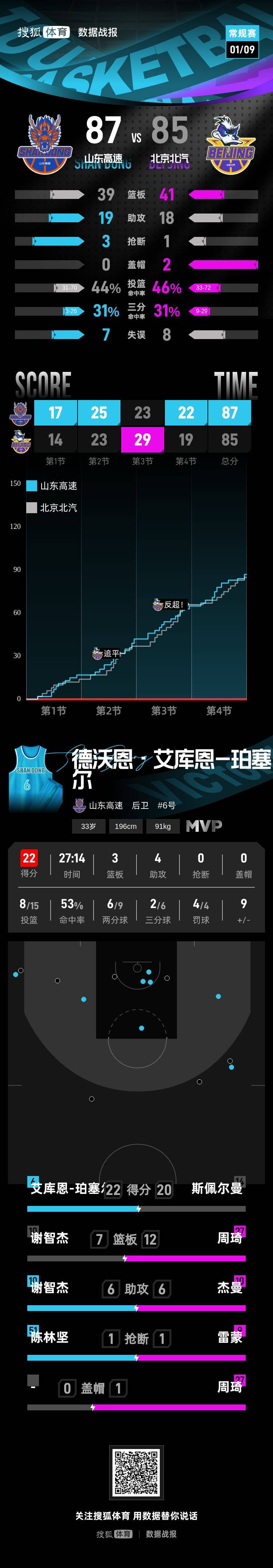 【搜狐体育战报】北京时间1月9日CBA常规赛第12轮,客场作战的山东高速以87-85绝杀北京北汽,山东高速取得5连胜。双方在最后时刻战成85平,握有最后一攻的北京首钢出现失误,山东男篮依靠珀塞尔的上篮绝杀了北京首钢。德沃恩·艾库恩-珀塞尔22分3篮板4助攻,奥马里-斯佩尔曼20分9篮板3助攻。