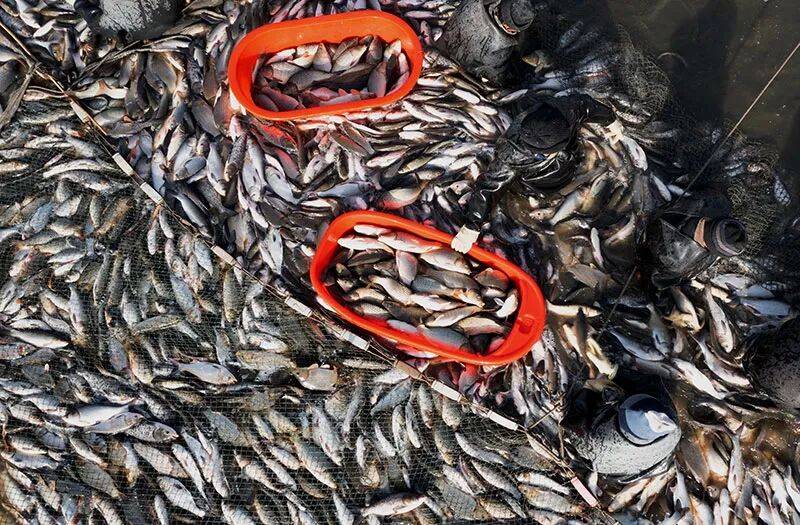 河北省唐山市丰南区老铺村的村民在鱼塘捕捞淡水鱼。图源:新华社