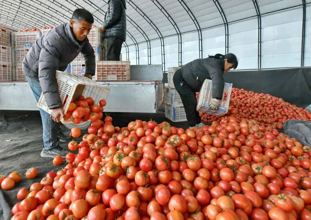 2025年12月29日,河北省肃宁县万里镇一家蔬菜种植合作社的社员将收获的西红柿卸车。图源:新华社