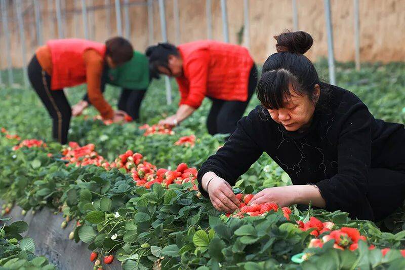 农户在陕西省渭南市合阳县路井镇一家庭农场采摘草莓。图源:新华社