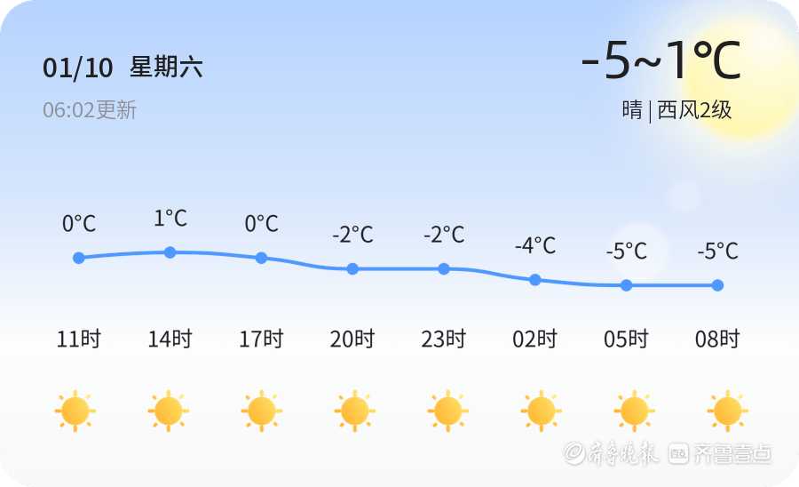 今天是2026年1月10日,农历十一月廿二,东营市迎来晴好天气,但气温较低,最高气温为1℃,最低气温为-5℃,风向为西风,风力2级,空气湿度25%,空气质量状况为良好。由于寒潮天气持续,市民出行时需注意防寒保暖,建议佩戴围巾、手套等御寒装备。驾车出行的市民需注意路面结冰情况,减速慢行,确保行车安全。 PM2.5指数为42,属于良好级别,市民可以正常进行户外活动。