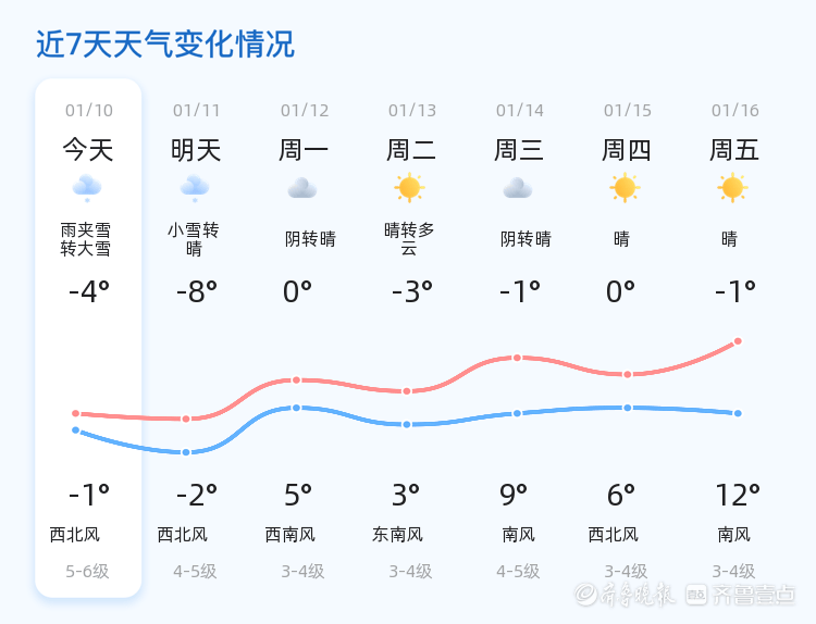 今天是2026年1月10日(农历十一月廿二),星期六。威海市今天迎来雨夹雪转大雪天气,气温在-4℃至-1℃之间,西风4级,空气湿度45%,PM2.5指数为54,空气质量良好。各区均出现雨夹雪转大雪天气,市民出行需注意防滑保暖。