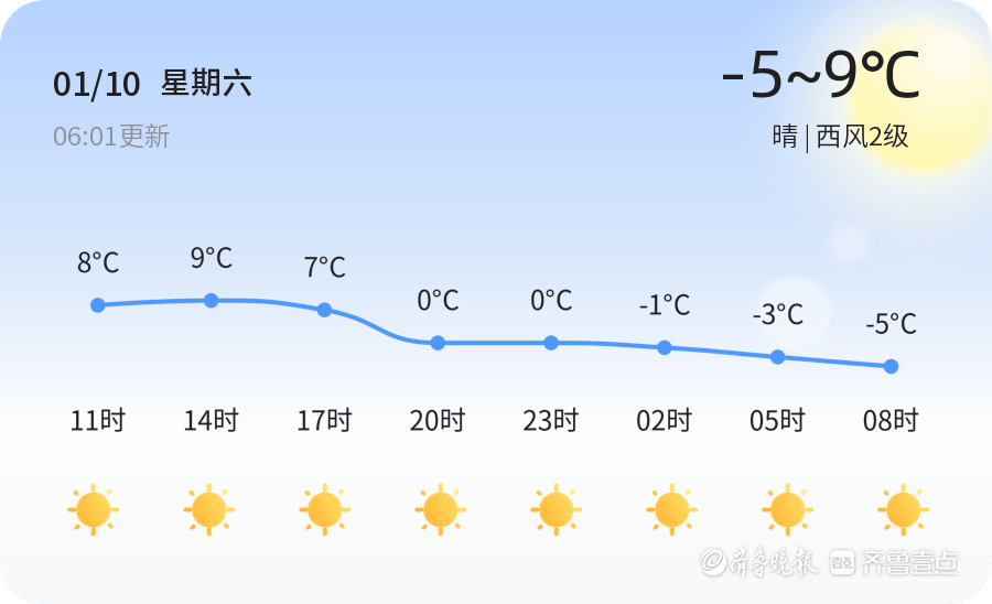 今天是1月10日,星期六,农历十一月廿二。枣庄市今天天气晴朗,白天气温最高可达9℃,夜间最低气温为-5℃。目前气温为3.3℃,西风2级,空气湿度26%,PM2.5指数为150。各区县天气情况总体稳定,以晴好天气为主,风力较小,适宜户外活动。