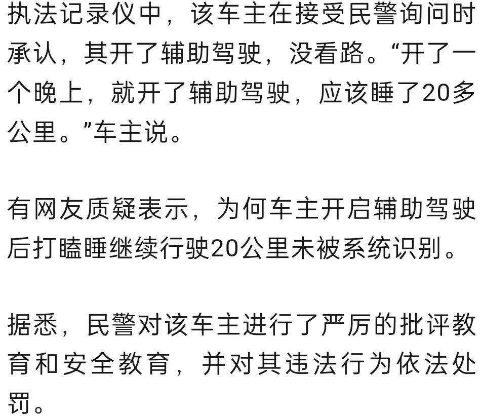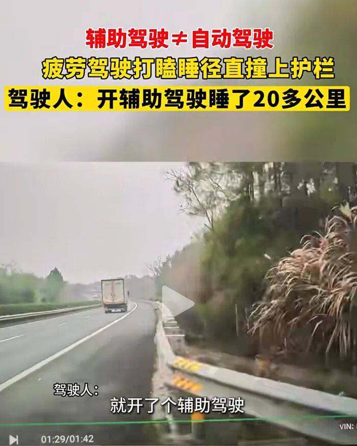 1月7日,湖南高速警察在其官微公布一起车主驾驶新能源汽车,开启辅助驾驶后打瞌睡长达20公里撞上护栏的事故。