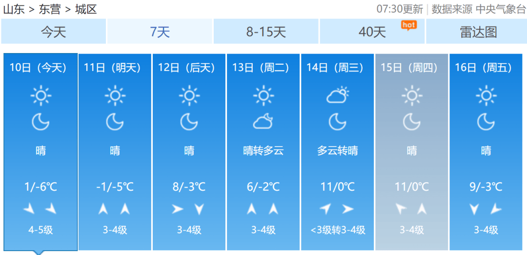 10日夜间到11日白天,烟台北部和威海天气阴有中到大雪局部暴雪转多云,其他地区天气晴到少云。半岛地区北风5~7级阵风8~9级减弱到3~4级,滨州、东营、潍坊和日照北风5~7级阵风8~9级转南风3~4级,其他地区北风转南风3~4级。