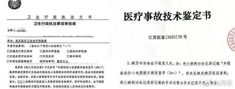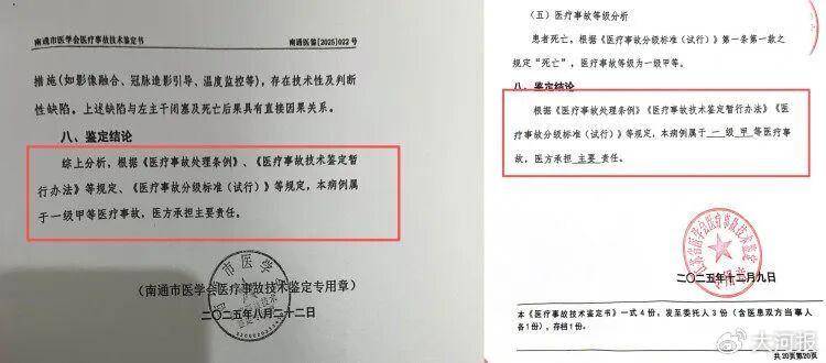 2025年12月9日,江苏省医学会《医疗事故鉴定书》显示,该医疗事故为一级甲等。当地公安机关也已对宋女士家属报警的医疗事故一案立案调查。