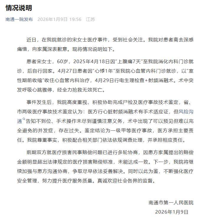 1月9日,江苏省南通市第一人民医院发布情况说明: