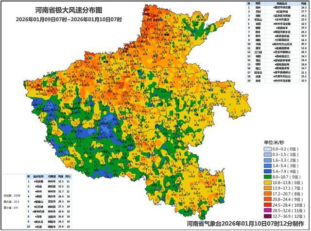 昨天河南出现6到7级大风,其中西北部、中西部局地9到11级,林州市马安脑风速达32.5米/秒(11级),位列全省首位。
