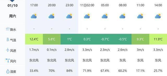 今天是2026年1月10日,武汉白天天气为多云,夜间天气为多云,最高气温14℃,最低气温0℃,东北风微风,空气湿度19%,体感温度11.0℃,空气质量良。早晚气温较低,体感偏冷,公众外出请注意适当增添衣物,避免受凉感冒。