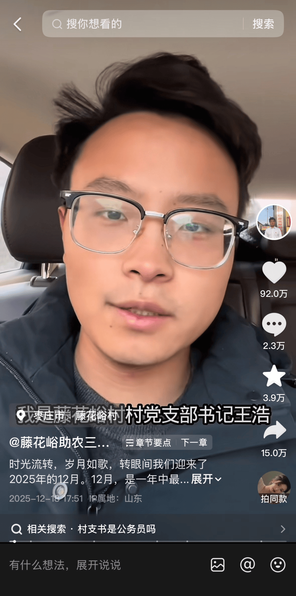 “你之前说修了水泥路,能不能发出来看看?”正是直播间里这条观众留言,促成了山东省枣庄市山亭区徐庄镇藤花峪村党支部书记王浩的视频创作——他用手机挑选了一些自己曾经的拍摄素材,将维修水渠、硬化道路、改造窄桥、接通自来水、安装路灯等一件件民生实事剪辑成片随手发布。没想到,这条朴素无华的视频迅速火爆网络,网友纷纷点赞“把申论写在大地上”。