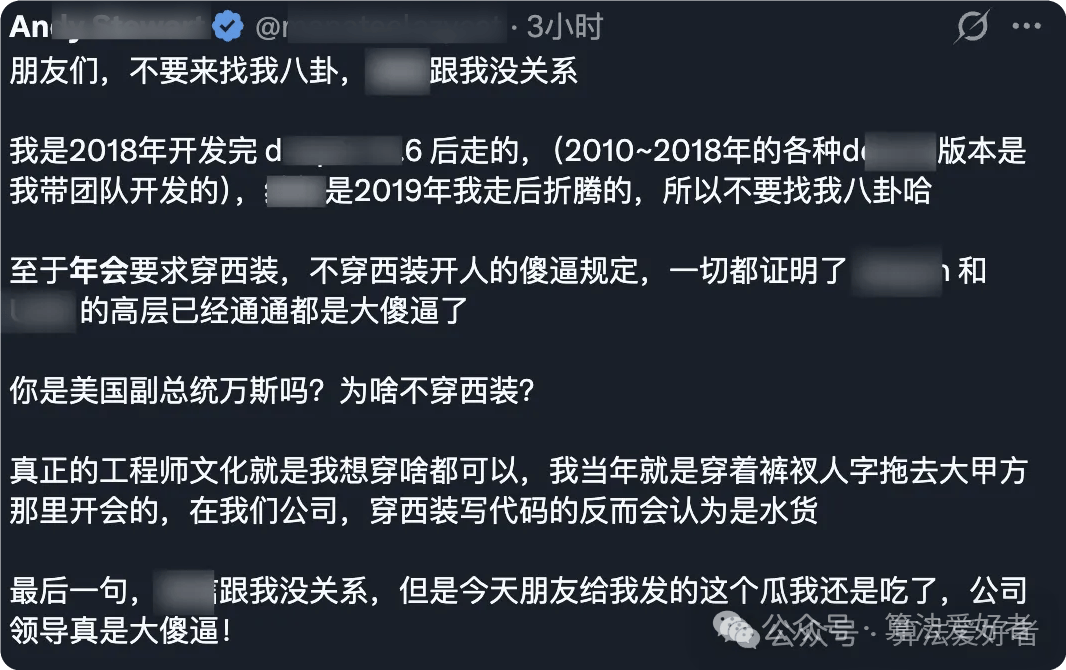 这个瓜还把该公司任职 8 年的老程序员炸出来了,他吐槽表示:“ 真正的工程师文化就是我想穿啥都可以,我当年就是穿着裤衩人字拖去大甲方那里开会的,在我们公司,穿西装写代码的反而会认为是水货。”
