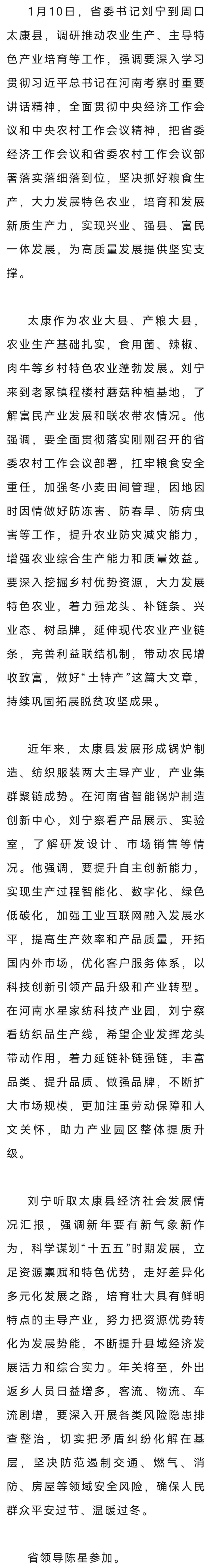 刘宁到周口太康县调研推动工作时强调 抓好粮食生产发展特色农业 实现兴业强县富民一体发展