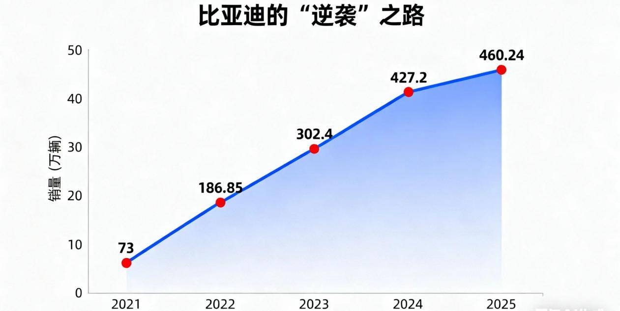 先说说比亚迪这几年的“成绩单”。从2021年卖73万辆,到2025年冲到460多万辆,直接拿下全球新能源销冠,海外市场也爆了,2025年卖了100多万辆,同比涨了145%!不过呢,家大业大也有新挑战,2025年销量增速稍微慢了点,2026年还想冲580万辆的目标,所以得开辟新“战场”。