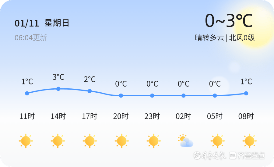 今天是2026年1月11日,农历十一月廿三,济宁市迎来晴转多云的天气。全市各区天气状况总体平稳,白天气温在0℃至3℃之间,北风0级,空气湿度为39%,PM2.5指数50,空气质量良好。市民出行时可感受冬日的暖阳,但早晚温差较大,需注意保暖。