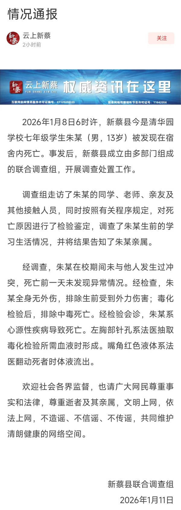 1月8日6时许,新蔡县今是清华园学校七年级学生朱某(男,13岁)被发现在宿舍内死亡。事发后,新蔡县成立由多部门组成的联合调查组,开展调查处置工作。