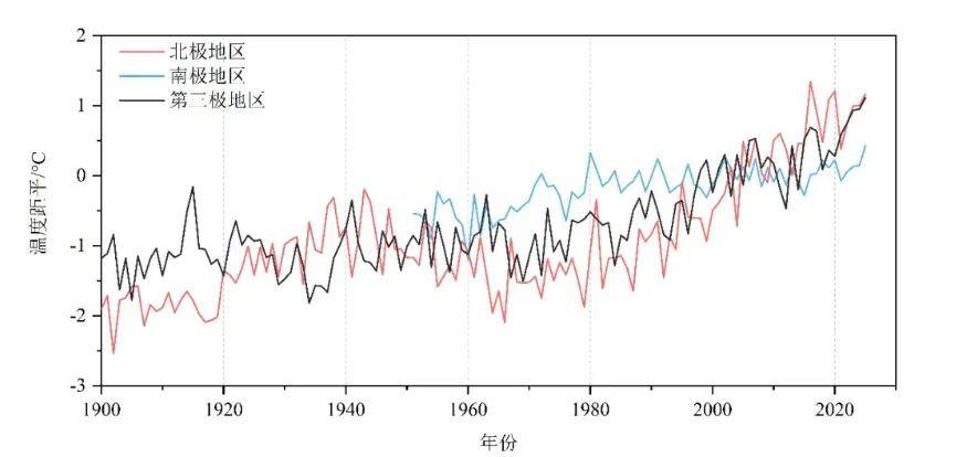 当然,事实也是如此,国家气候中心也才发布了关于北极区域的数据,其2025年,北极地区平均温度较常年值偏高1.17℃,位列历史第三位,南极地区和第三极地区(25-50°N, 65-105°E)平均温度较常年值分别偏高0.43℃和1.12℃,均突破历史极值。
