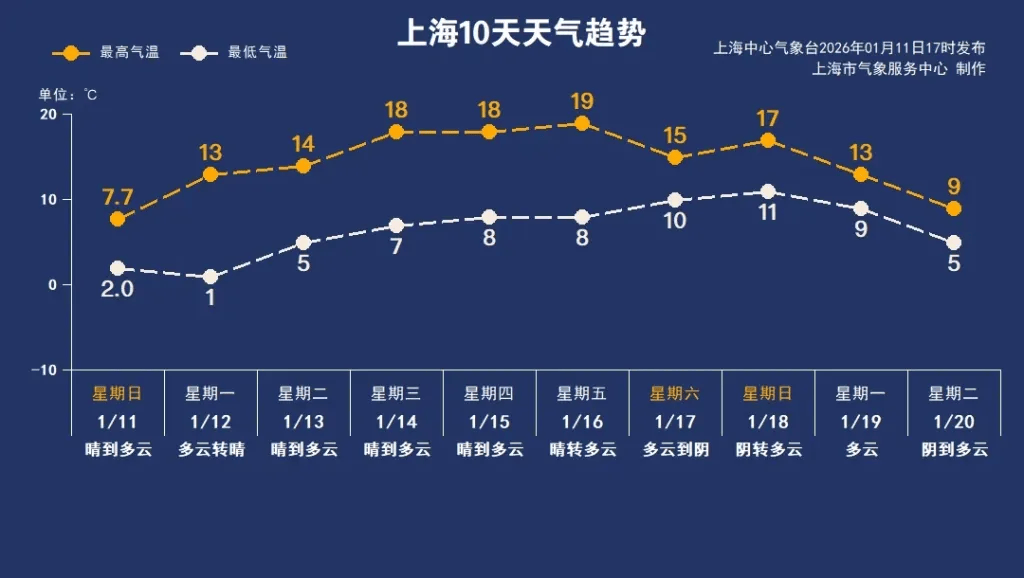 下周,上海天气晴好,气温将逐日回升,至下周五最高温可达19℃左右。