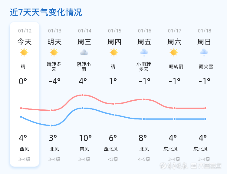 预计明天(1月13日),威海市天气将由晴转多云,气温有所下降,最低气温为-4℃,最高气温为3℃。相比今天,明天的天气更加寒冷,北风3-4级,市民需提前做好防寒准备。