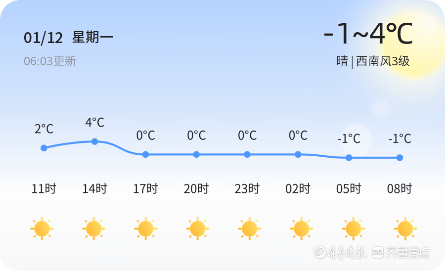 今天是1月12日,星期一,农历十一月廿四。烟台市今天天气晴朗,气温在-1℃至4℃之间,西南风3级,空气湿度为48%。PM2.5指数为29,空气质量为优。当前温度为-2.8℃,适宜外出活动,但需注意防寒保暖。出行时建议穿着厚实的冬装,随身携带雨具以备不时之需。