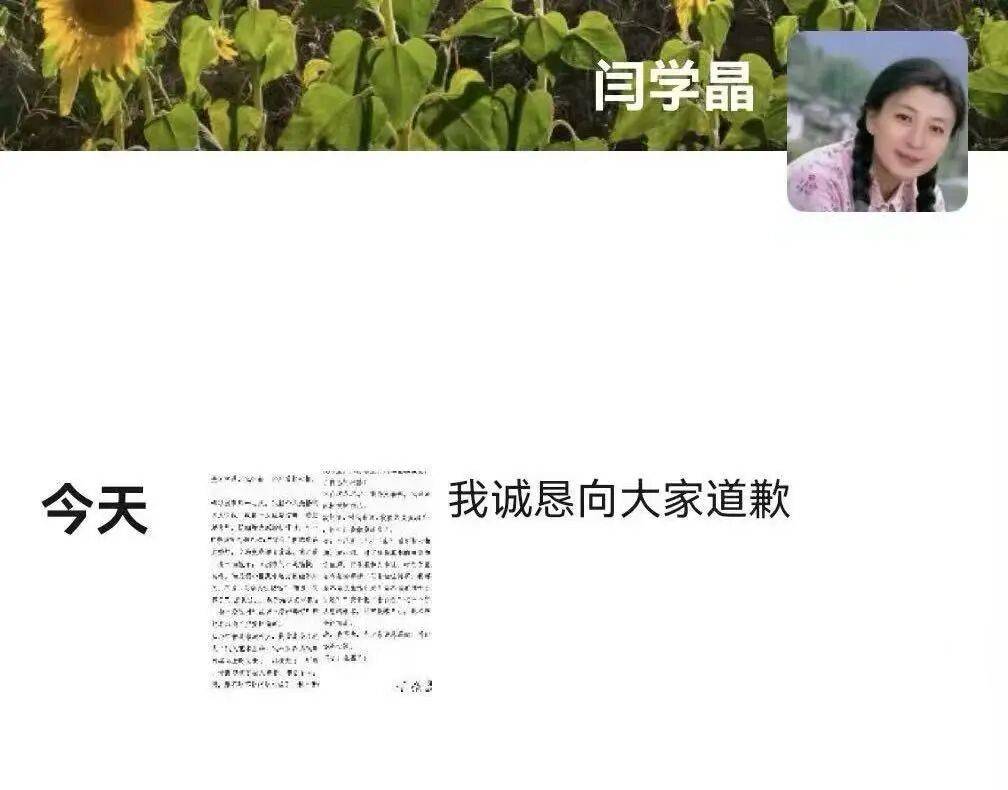 文中提到,“我是闫学晶。我怀着十分沉重的心情,向大家诚恳道歉!事情刚出来那一两天,我整个人是懵的。看到网上那么多人说我,我第一反应是惊讶、委屈,但等我真正鼓起勇气,仔细看大家的批评时,才一下子被戳醒了。”