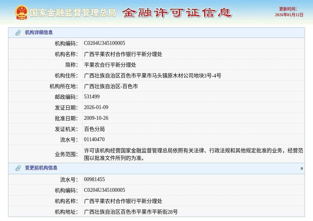 1月12日,根据国家金融监管总局许可证信息查询平台,广西平果农村合作银行平新分理处换发金融许可证,发证日期2026年1月9日。