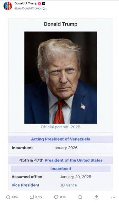 中新网1月12日电 综合美媒12日报道,美国总统特朗普在其社交平台“真实社交”(Truth Social)上发布了一张图片,图上写着“委内瑞拉代总统”。
