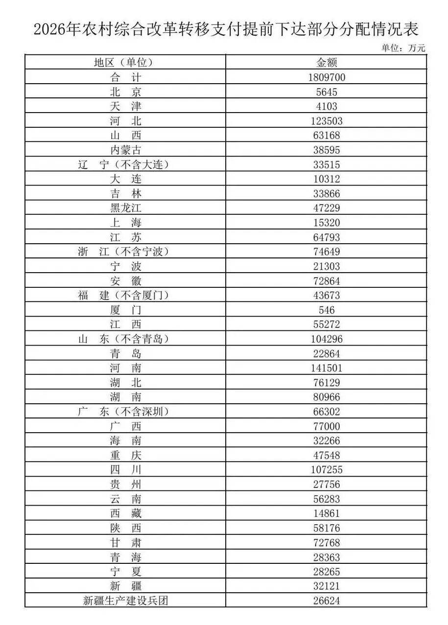 财政部于2025年底提前下达2026年农村综合改革转移支付资金180.97亿元(具体分配情况见下表),各省份也陆续分解下达,支持各地推进农村综合改革各项工作。