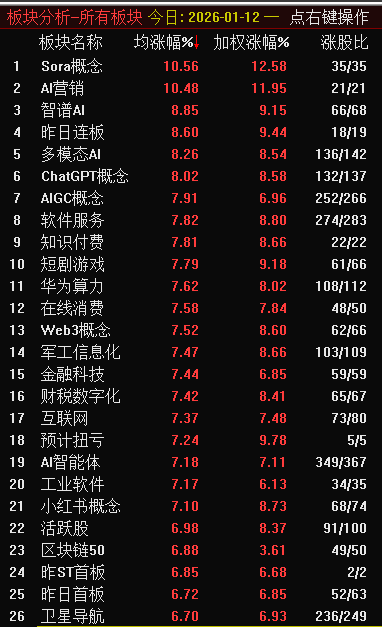 通达信统计数据显示,当天A股股票涨跌比例是4144:1182;涨跌幅超过10%的个股比例是282:3;涨跌幅大于5%的个股比例是581:33。盘面看,高精尖领域上演涨停潮,sora、AI营销板块狂飙逾10%,智谱AI、多模态AI、AIGC、AI智能体板块飙升7%-10%不等,军工信息化、软件服务、华为算力等板块涨幅也多达7%以上。
