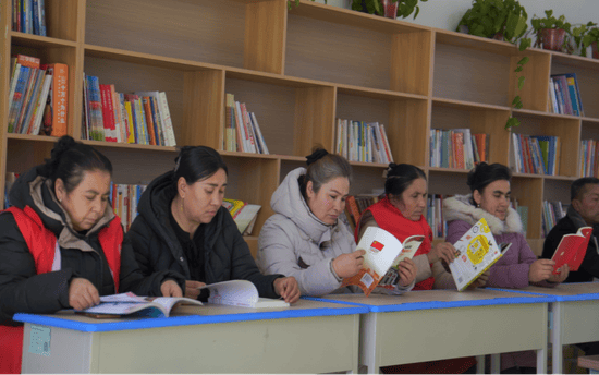 在党群服务中心,党员和各族群众走进图书室,工作队组织村民开展全民阅读活动,营造了全民阅读的良好氛围。一排排书架上整齐摆放着各类书籍,村民们围坐在一起,阅读有关种植业、养殖业、农技类、果树修剪、医疗保健等方面的书籍,整个图书室内洋溢着浓厚的学习氛围。村民瓦日斯江·瓦力丁是图书室的常客,一有空闲时间他就来到这里,阅读各类书籍。村民阿不都沙拉木·沙地克说:“大家在一起读书,分享自己的阅读感受,养成良好的阅读习惯很有必要”。