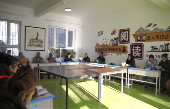 村民在图书室阅读各类书籍。
