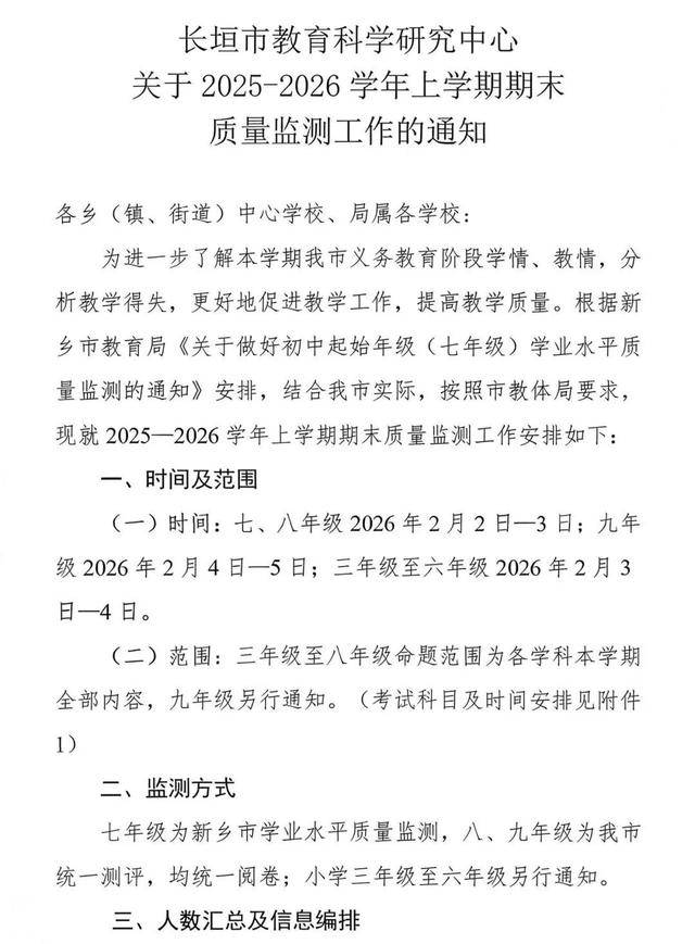 2025-2026学年第一学期即将结束,寒假将至。为确保师生度过一个安全、愉快、文明、健康的假期,根据河南省教育厅有关要求,结合我市实际,现就全市中小学(幼儿园)、中职学校寒假有关工作安排通知如下: