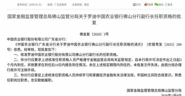 2026年1月12日,根据国家金融监督管理总局消息,《中国农业银行广东省分行关于罗迪中国农业银行佛山分行副行长任职资格的请示》获得通过,批复罗迪中国农业银行股份有限公司佛山分行副行长的任职资格。