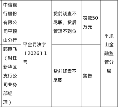 罚单显示,中信银行股份有限公司平顶山分行的违法违规事实为:贷前调查不尽职、贷后管理不到位。