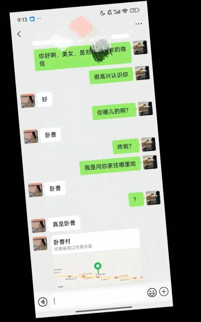上面这段对话,来自网友发布的截图,大致内容是两名年轻人刚开始相识,其中一位家住商水谭庄的网友答复家住“卧曹村”引发了误会和尴尬。