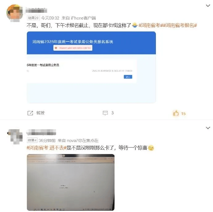 1月12日上午,有网友反映,河南省考报名系统自1月11日21时后出现无法访问的情况。不少考生遭遇网页卡顿、页面崩溃或无法访问提示,因此很担心错过考试。