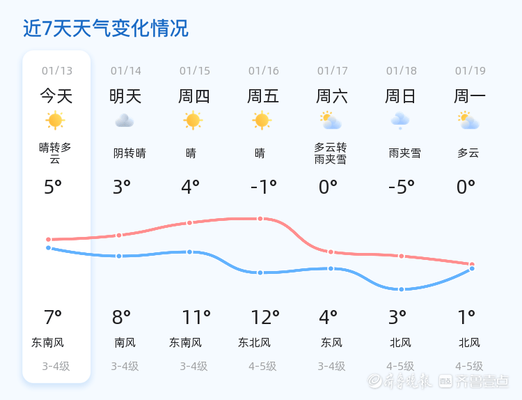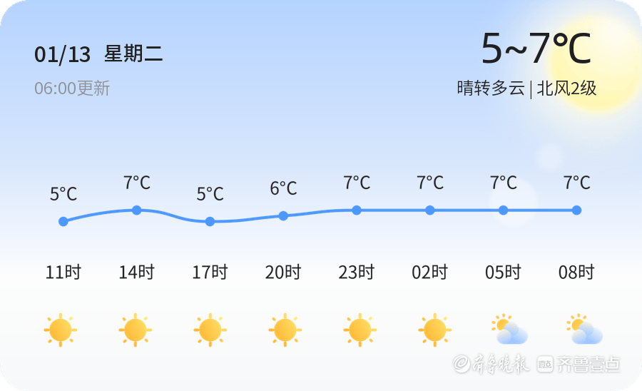今天是2026年1月13日,星期二,农历十一月廿五。青岛市迎来了一天的晴转多云天气,气温适中,全市大部分地区最高气温为7℃,最低气温为5℃。今天早晨6点的实时温度为1.3℃,空气质量良好,PM2.5指数为95,风力较小,北风2级,空气湿度为57%。各区天气情况总体平稳,以晴转多云为主,适合市民户外活动。