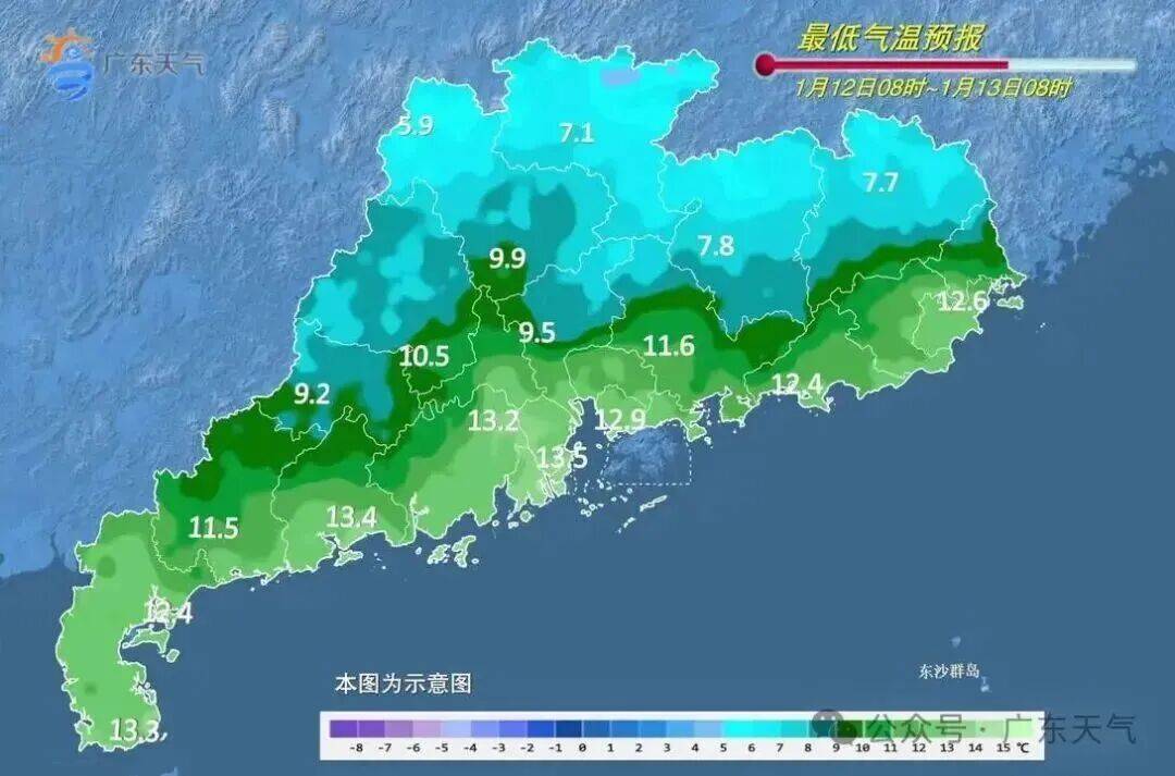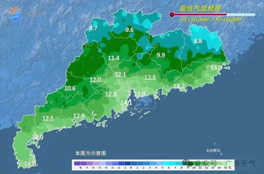 13日,全省大部多云到晴天,粤西市县早晚有轻雾。虽然白天气温回升,但由于早晨晴空辐射效应明显,粤北偏北市县仍有5℃以下的低温。全省最低气温分布为:粤北5-8℃,南部沿海13-15℃,其余市县9-12℃。