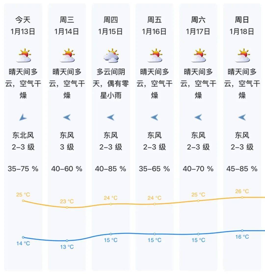 今天(1月13日),深圳将维持晴天干燥的好天气,气温在14-25℃之间,白天温暖舒适,非常适合户外活动。