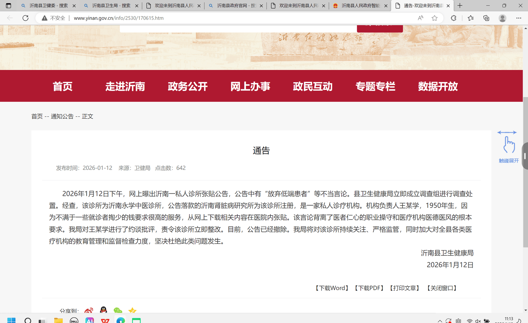 通过查询沂南县人民政府官网,红星新闻看到,2026年1月12日,沂南县卫生健康局发布通报,称经查该诊所为沂南永学中医诊所,公告落款的沂南肾脏病研究所为该诊所注册,是一家私人诊疗机构。机构负责人王某学,1950年生,因为不满于一些就诊者掏少的钱要求很高的服务,从网上下载相关内容在医院内张贴。
