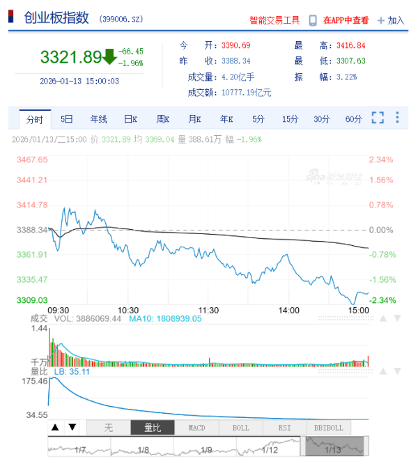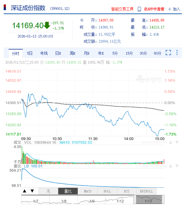 1月13日,三大指数集体调整,沪指终结17连阳。截至收盘,沪指跌0.64%,深成指跌1.37%,创业板指创业板指冲高回落,跌1.96%。