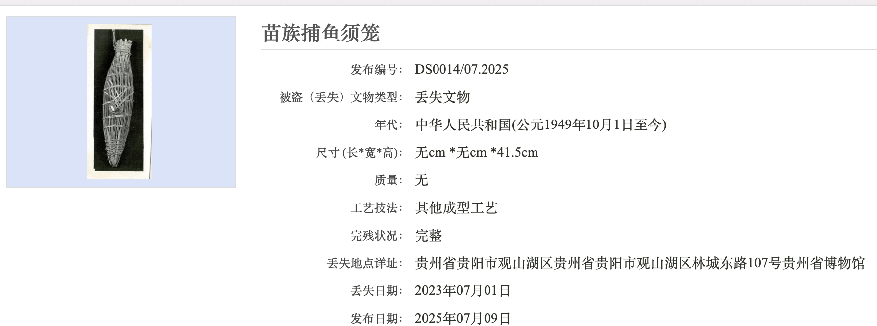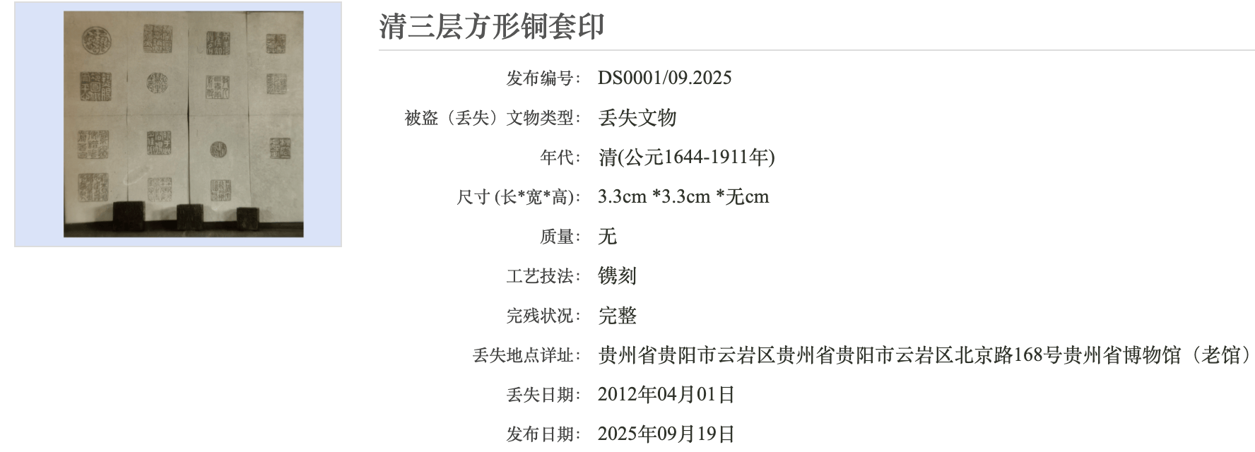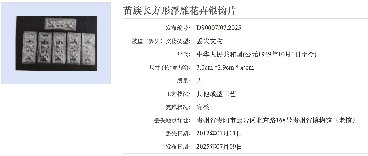 据查,2010年之后丢失的,除了清三层方形铜套印外,还有苗族工艺品,包括捕鱼须笼,以及苗族长方形浮雕花卉银钩片。