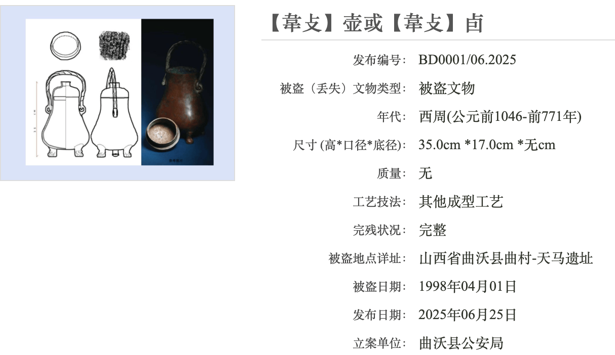 其中,历史最悠久的是西周时期的壶(或卣),年代可追溯至公元前1046年-前771年,是本次公布文物中年代最早的一件。这件被盗文物高35.0cm,被盗地点为山西省曲沃县曲村-天马遗址,被盗日期为1998年4月1日。