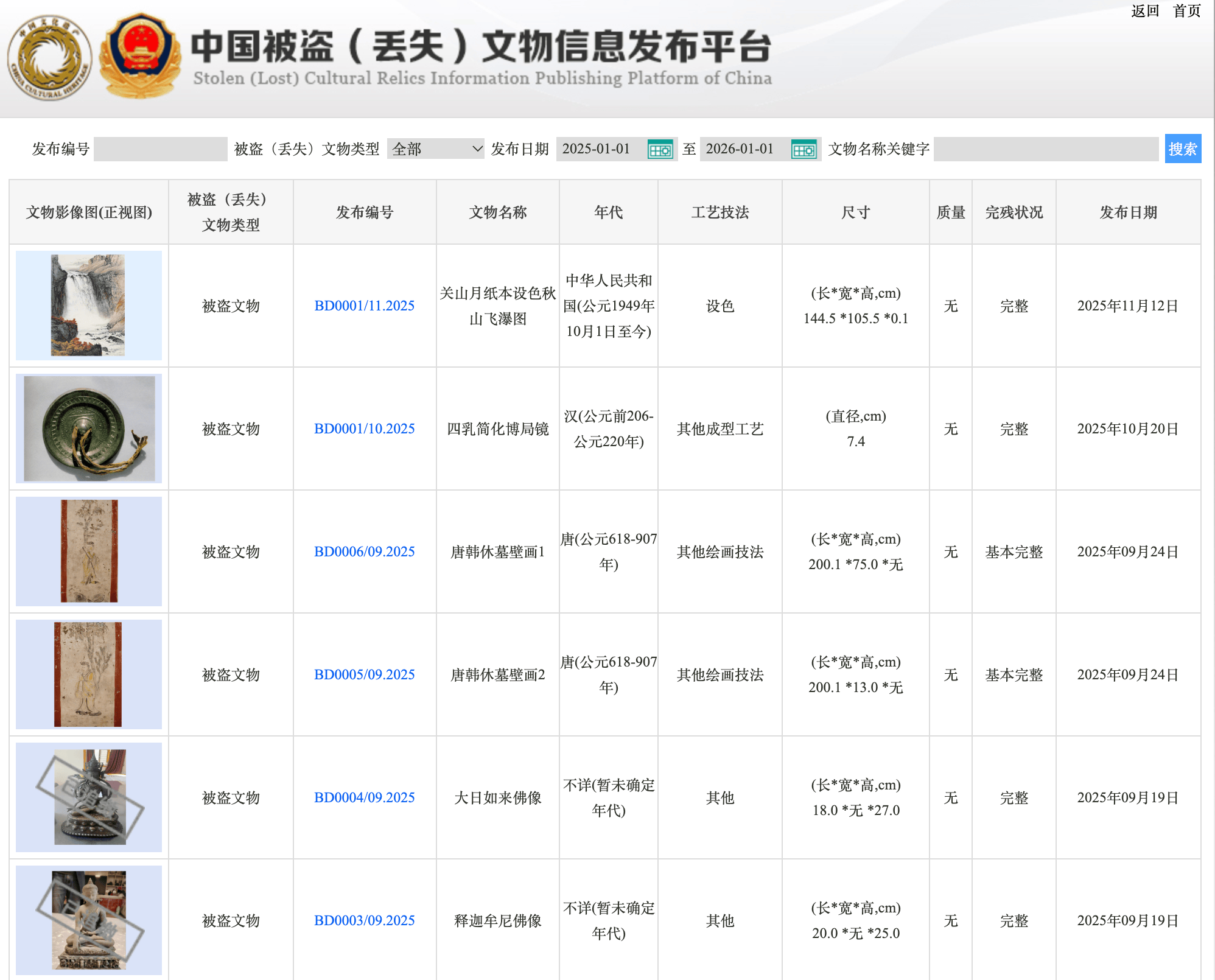 被盗文物的信息页面