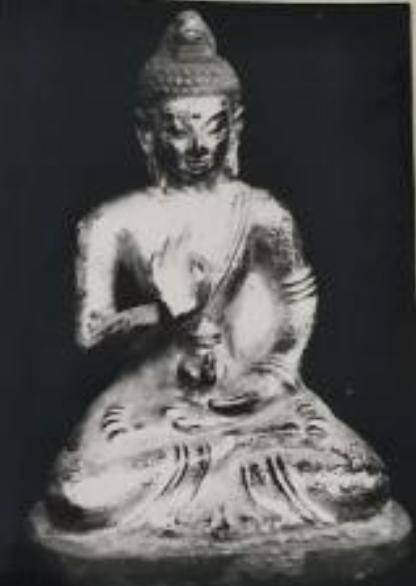 第一尊为弥勒铜像,高16厘米。头部浑圆,神态祥和。身披通肩袈裟,衣褶线条流畅,背后设镂空火焰纹背光。铜像原有部分残缺。另一尊为释迦佛铜座像,高9.2厘米,基本保存完整。佛像呈结跏趺坐姿,面部圆润,双目微垂,神态沉静。左手置于膝上,掌心向上;右手抬至胸前,仪态庄重肃穆。