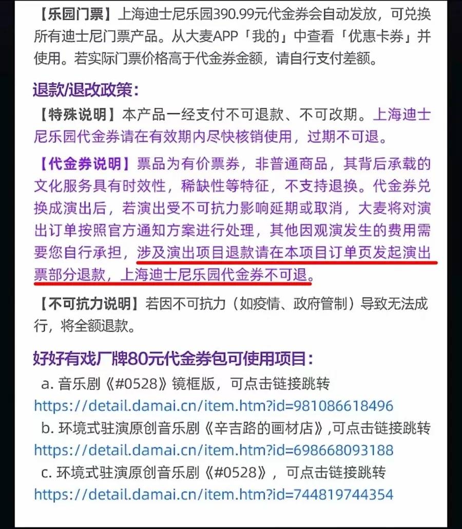 记者搜索发现,江先生所购买的套餐在详情页开头就提到,套餐内容包含2张演出代金券和1张迪士尼门票代金券。此外,说明还进一步表示,代金券金额为390.99元,演出票可部分退款,乐园门票代金券不可退。