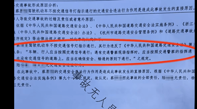 1月8日,蔡师傅称收到萧山交警大队的结论,认定蔡师傅“闯红灯,要负全责。”蔡师傅表示,当时是交警示意自己跟着他走,“现在出了事情,还判我全责。我确实委屈、困惑、迷茫。”
