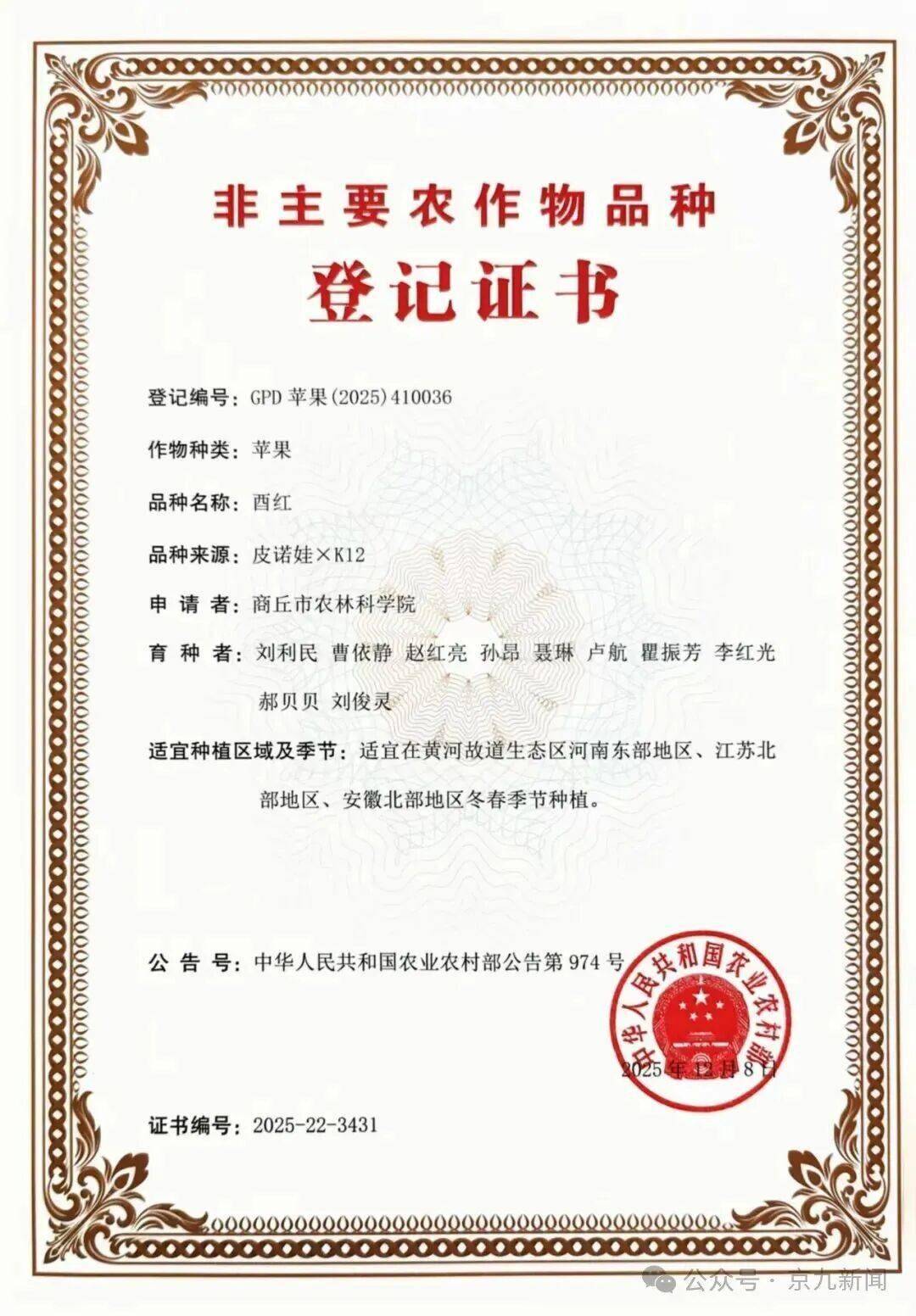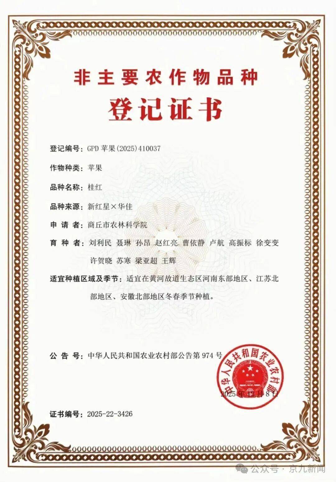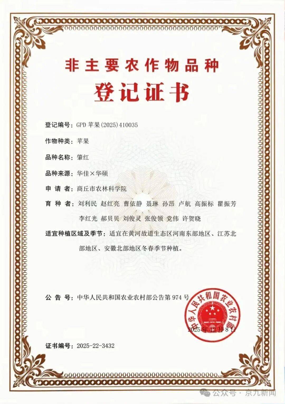 一枚鲜果关乎“果盘子”供给,一份登记彰显种业创新力量。2025年12月,商丘市农林科学院自主培育的“肇红”“酉红”“桂红”3个早、中熟苹果新品种通过农业农村部非主要农作物品种登记,正式获得市场推广“通行证”。这3个兼具成熟期早、优质、抗逆等特性的新品种,将为黄河故道苹果产区品种迭代、结构调整、果业高质量发展注入新动能。