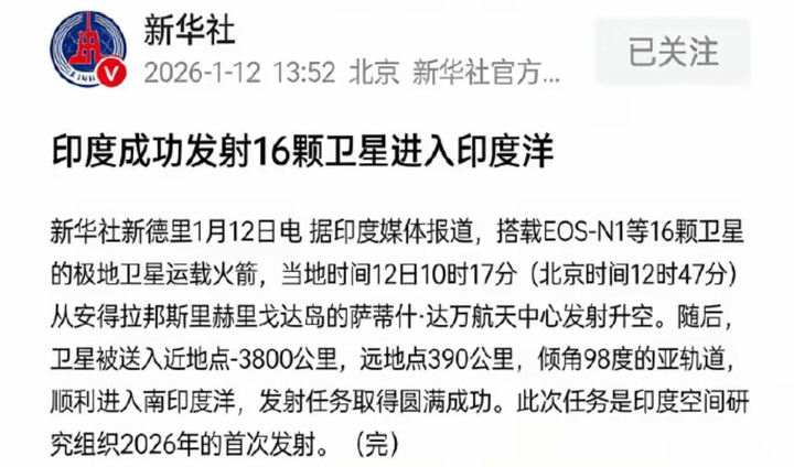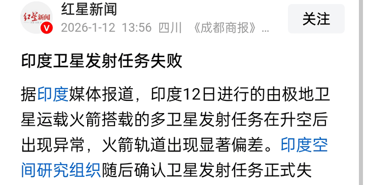 消息来源:《红星新闻》1月12日报道《印度卫星发射任务失败》